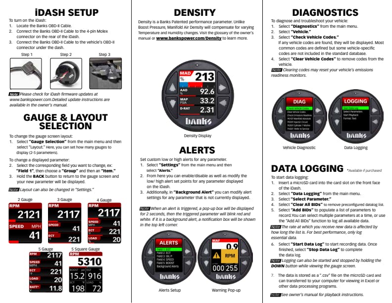 Do things other gauges can't! Groundbreaking DataMonster now works with vehicles that do not have OBD. Display 2-8 values with over 300 parameters available (varies Banks Sensors attached). Patented Density parameters included (exclusive to Banks). Log 100 parameters at a time, including up to 20 min/max values with a microSD card (included). Built-in Shift/RPM Light. Connect multiple iDash gauges. Auto-Dimming Feature. US Patents # 7,593,808 B2 & # 7,254,477 B1 Key Features: Customizable gauge display, Read Boost Pressure, EGT and so much more, Avoid costly repairs by monitoring important sensors, Display 2-8 values, Over 300 parameters available, View Data your dash does not display, Displays accurate values your OEM dash gauges filter, Includes patented Density Suite (exclusive to Banks), Adds Data-Logging functionality (incl 4gb micro-SD), Log up 100 parameters at a time, Log up to 20 min/max values, Built-in Shift & RPM Light, Connect multiple iDash gauges, Auto-Dimming Feature, Fits standard 52mm (2-1/16 inch) gauge mounts, Features vary by application